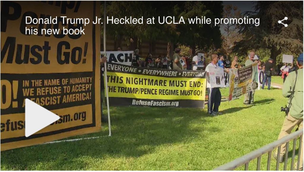 Donald Trump Jr. heckled at UCLA while promoting his new book (excerpts from coverage) Activist group Refuse Fascism has planned a demonstration in protest, calling President Donald Trump’s “Make America Great Again” platform a “21st century fascist program of Manifest Destiny,” and a “specifically American culmination of white supremacy, misogyny and xenophobia.” The group also […]