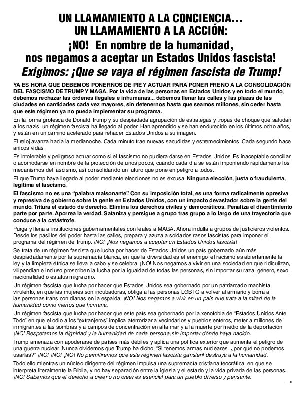CALL TO CONSCIENCE . . . A CALL TO ACT: NOW IS THE TIME WHEN WE MUST RISE UP AND ACT TO STOP THE CONSOLIDATION OF TRUMP/MAGA FASCISM (Spanish 2-sided)