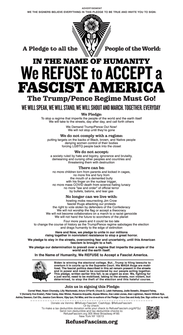 RefuseFascism.org works to unite all who can be united, from many different backgrounds and political perspectives, to join in mass, nonviolent protest and resistance in the streets and throughout society. We act with courage and conviction, refusing to stop until we create such a profound political crisis that Trump cannot impose his fascist program or maintain his hold on power. We pledge and demand: In the Name of Humanity, We Refuse to Accept a Fascist America! The Trump Fascist Regime Must Go Now!