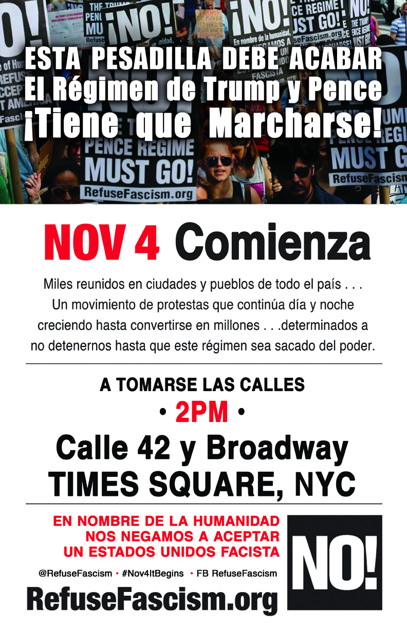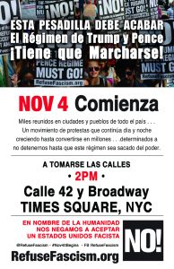 El 4 de noviembre de 2017, nos pondremos de pie hombro a hombro con convicción y valor, superando el miedo y la incertidumbre, para insistir que: ¡Esta pesadilla tiene que terminar: El régimen de Trump y Pence tiene que MARCHARSE!