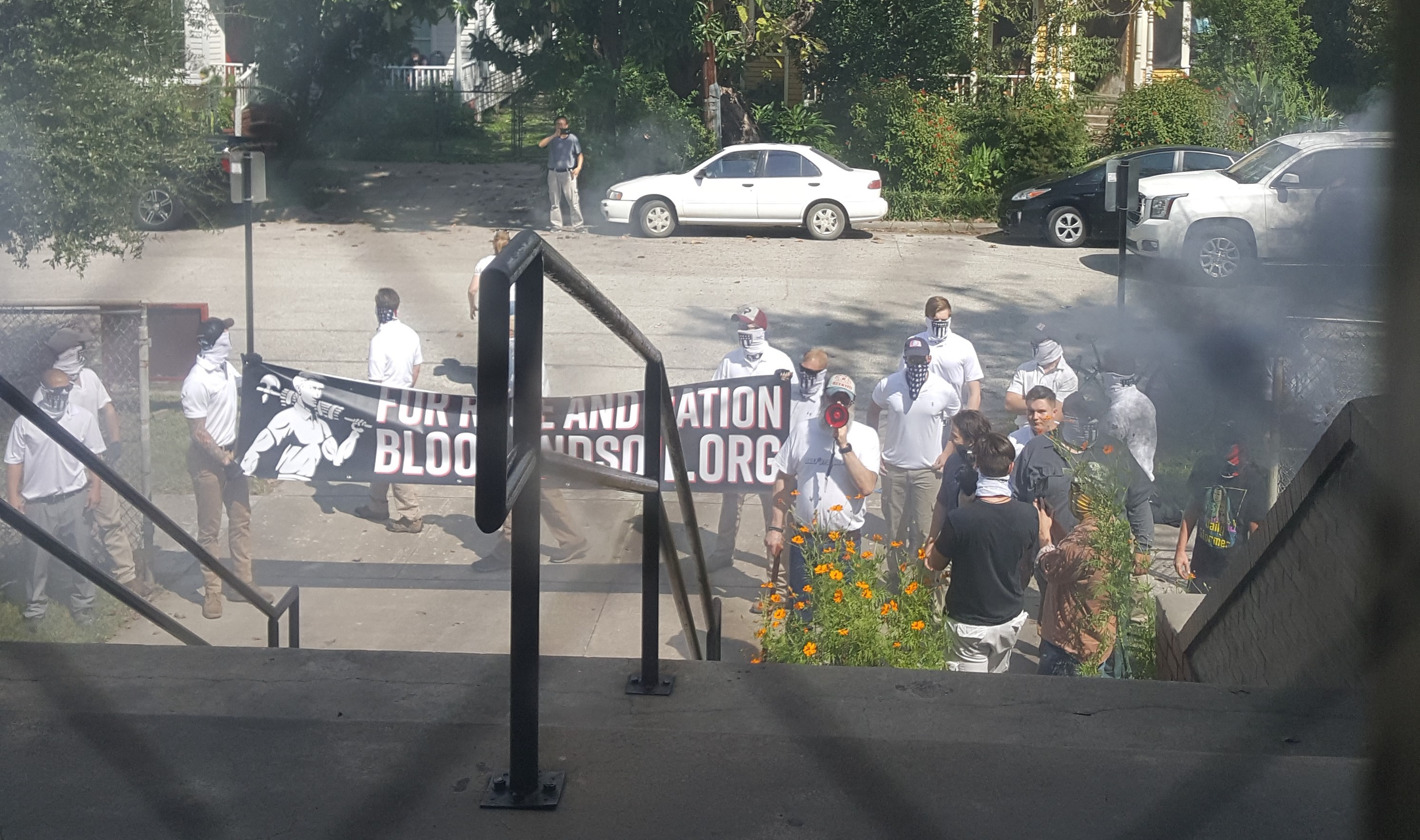 On Sunday, September 24th, a group of about 30 nazis gathered outside a community center where the Houston Anarchist Book Fair was being held. Wearing white shirts, khaki pants and bandanas over their faces, they held a banner with the slogan, “For Race and Nation,” and demanded to be let in, lighting flares, shouting racist chants and challenging organizers to come out and fight. People inside the community center held the doors shut and refused to let them in.