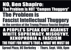 Sproul Plaza is where students, faculty, and all concerned people should be on September 14 when Ben Shapiro speaks at 7pm on so-called “Campus Thuggery.” Shapiro is coming to campus to spread ugly fascist views dressed up in slick-talking “intellectual” garb. Beneath his “reasonable” tone lies Shapiro’s real thuggery: Shapiro mocked Trayvon Martin on what would have been his 21st birthday, insists that being transgender is a “mental illness,” compares abortion to the Holocaust and thinks women should be forced to bear children against their will, argues that racial discrimination is not a “continuing factor in American life” and that poverty among Black people is not a result of racism but of Black culture, believes in a “clash of civilizations” and calls Islamic civilization “the polar opposite of the West,” wrote that “Arabs like to bomb crap and live in open sewage,” and more. This is harmful! He, along with fascists of many stripes, have targeted Berkeley because reversing Berkeley’s radical history would be a major advance for the consolidation of fascism on campuses everywhere and throughout society.