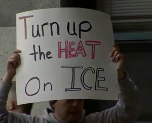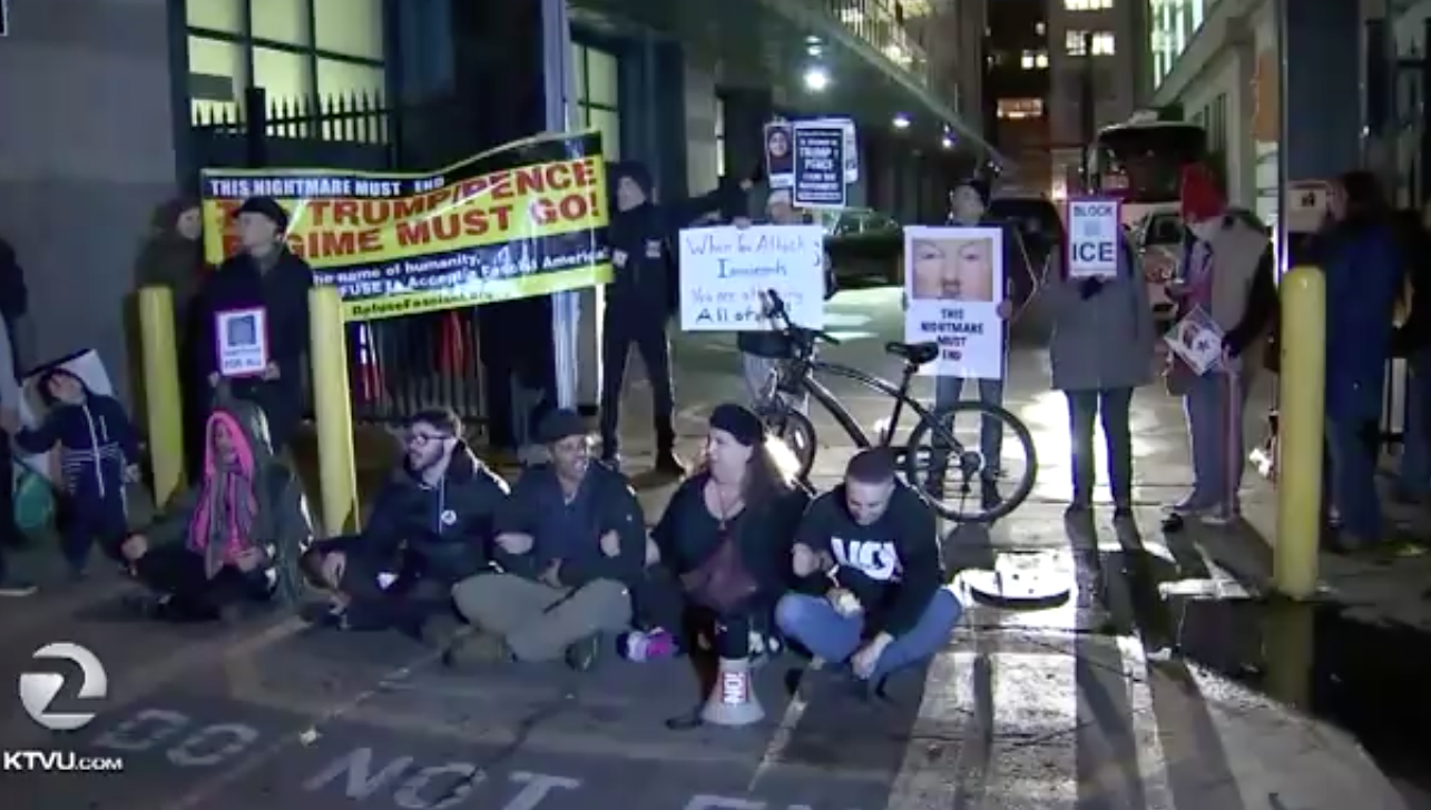 On Thursday, activists from Refuse Fascism, Code Pink, SF Occupy, SF Rising, the Women’s March, and a number of other organizations gathered outside the ICE headquarters, first rallying and then a crew stood in front of the gates where the ICE vans go in and out, carrying detainees. The crew blocking the gates declared that they would not let Ice’s business of persecuting immigrants go on – and issued a call to everyone in the Bay Area to take a stand – “if you come for the immigrants, you’ve got to come through us! If you come for the DACA youth, you have to come through us!”