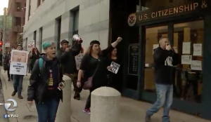 Throughout the action, voices from the bullhorns were urgent and strong – and called on everyone to refuse to accept an open white supremacist regime in power – to refuse to let the regime assault “undesirables”, rip apart families, and target political opponents. That we will mobilize to stop them now, and we will mobilize to drive out the regime: “we need a movement of millions in the streets!”