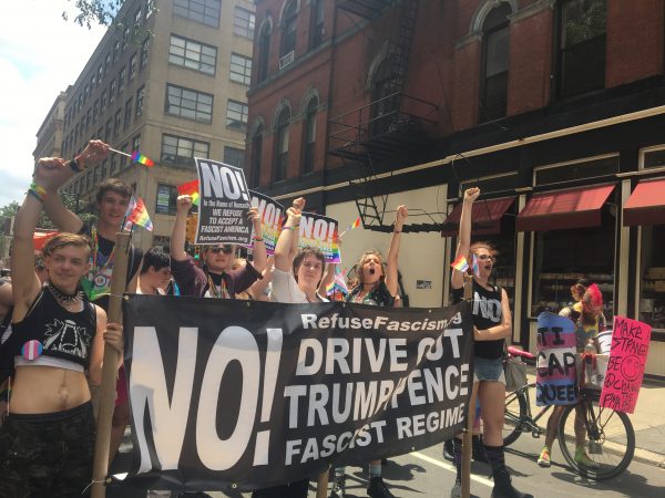 Pride parade viewers were consistently called on to join the Refuse Fascism Contingent. Marchers chanted, “Out of the closets and into the streets, drive out the fascist regime” and highlighted that driving out this regime isn’t a spectator sport. Dozens of people grabbed signs, stacks of stickers to distribute, fliers to pass around, and dragged family and friends in to march with us. As our banner and signs saying, “No! Drive Out the Trump/Pence Regime” over the new rainbow flag were held high for blocks you could not hear the contingents chants as thousands of viewers whistled, screamed, raised fists and drowned us out with support.