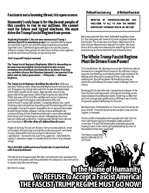 The Time Has Come For… The Fall Of The Fascist Trump Regime Beginning Nov. 5, 2025 Washington DC (Full Page B&W 2-Sided)