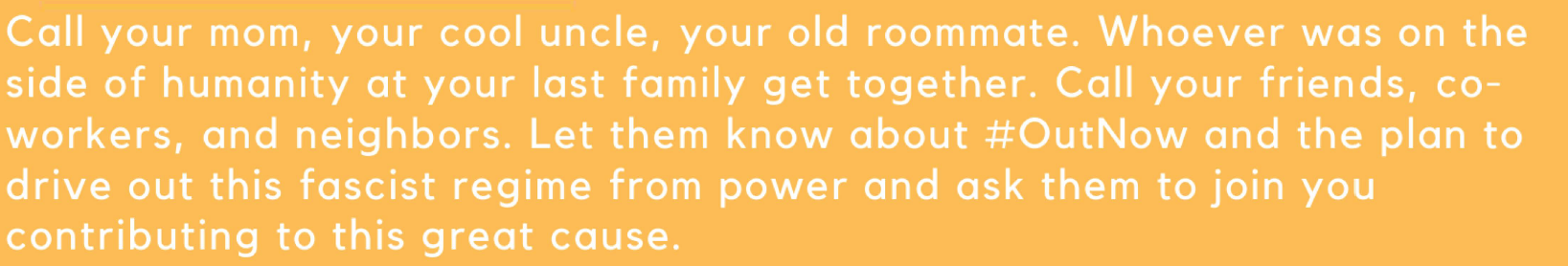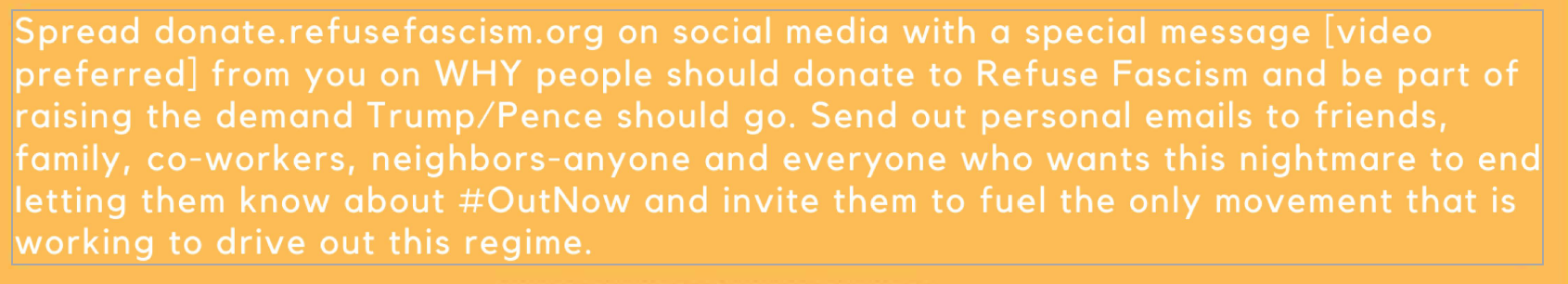 When you ask someone to donate, you are giving them a meaningful way to help stop a fascist America. By giving, a person concretely strengthens the #OutNow movement & the ability to mobilize the one force that can drive out the Trump/Pence Regime: millions of people in sustained nonviolent protests.
