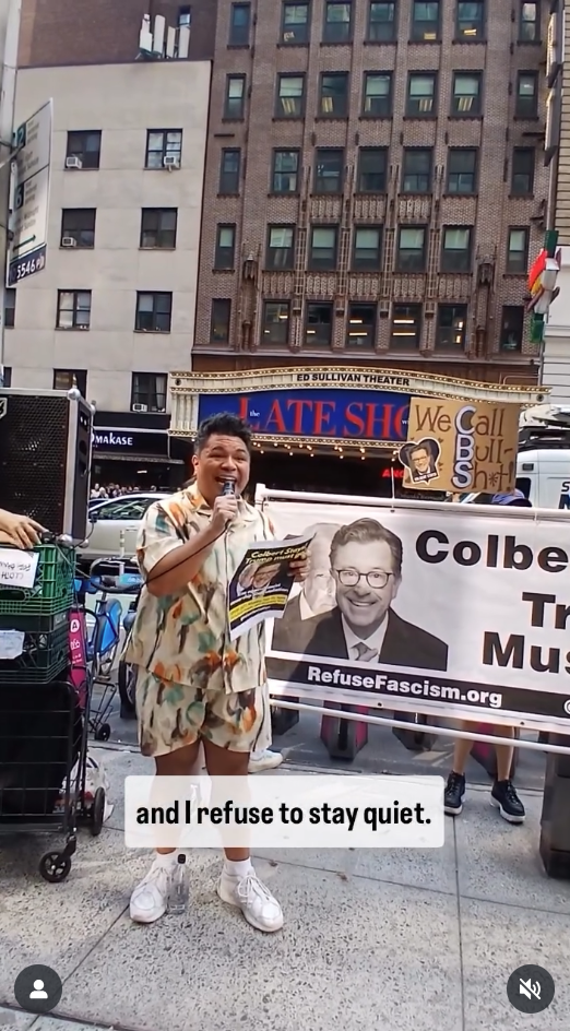 Emma Kaplan, an organizer of the protest, said, “We’re here because this is fascist censorship and fascist retaliation against Stephen Colbert. We’re calling on everyone right now to stand up and refuse to accept the censorship of voices of dissent. This is also coming at a time when Trump is kidnapping immigrants, targeting Democratic officials, opening up concentration camps, so we are saying that Trump Must Go Now and it’s up to all of us to stand up in mass refusal, to drive this regime from power.”