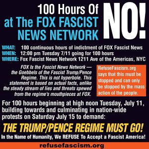 Sunsara Taylor, RefuseFascism.org, and many others will deliver a living indictment of the Fox Fascist News Network and the Trump/Pence Regime. For 100 Hours, day and night, they will call on people to come testify and protest against the Trump/Pence Regime and the hate-filled bullshit from the mouthpiece of FOX.