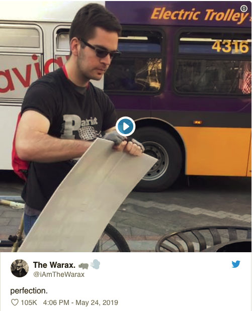The video was shot somewhere on the streets of an American city, though the location is unknown. One of the people recording the video offers a suggestion: “Hey genius, why don’t you take the lid off? You need a liberal to help you with that!”