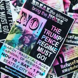 For more information about Refuse Fascism, visit the national website at RefuseFascism.org and the Seattle area Facebook page at facebook.com/RefuseFascismSea. There is a “Bring the Noise” parade happening this Saturday, November 18, at 1 p.m. at Seattle City Hall; people of all ages are invited to bring their instruments and all variety of noisemakers! Check out the Facebook event page for more details: facebook.com/events/1908315539178552.