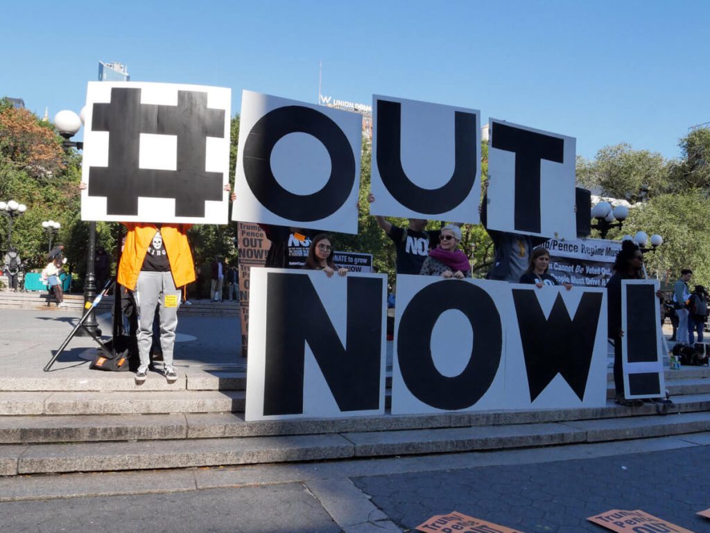 Once at Trump Tower, protesters raised signs to spell out #OUTNOW and created their own “tower” of items representing “crimes of this regime” including baby shoes for the children detained at the southern border and plastic bottles for rollbacks to environmentally progressive legislation.