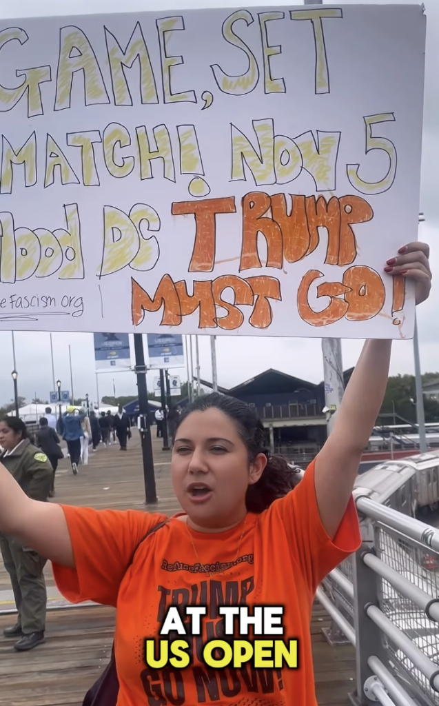 A scattering of protestors stood outside the grounds before the match. Among them was Emma Kaplan, a 33-year-old executive assistant from Brooklyn, distributing flyers that read “The Fall of the Trump Fascist Regime.” She was joined by three members of RefuseFascism.org, one hoisting a poster that declared “GAME, SET, MATCH! NOV 5, FLOOD DC. TRUMP MUST GO!”; another’s sign demanded the shutdown of “the whole Trump fascist regime.”
