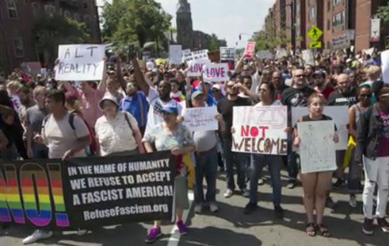There were homemade signs that said things like fascism is not up for debate. There was more clarity than at the Women’s March, or Science March, in DC a few months ago, on the nature of the regime. People who are doing congressional work are increasingly up against the reality that to keep doing what they have been is dreaming—it is not going to stop this. There were lots of unaffiliated young people, mostly white, on the march. More Black people joined in at the Boston Commons. Overall, there was a very celebratory mood downtown with the basic youth out in force saying we kicked the Klan’s asses. In some cases they got in the face of the police after the main march was over.