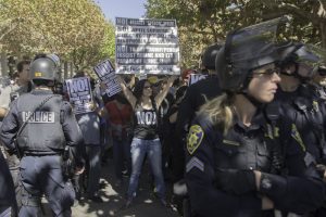 Milo Yiannopoulos and a crowd of his fascist supporters showed up this morning on Sproul Plaza to spew their fascist poison in the name of free speech. Again, the fascists had the collaboration if not outright support of the police, and the administration, who set up barricades around and through Sproul Plaza, lined it with dozens of riot police to make sure Yiannopoulos could speak, and then escorted Yiannopoulos in—this for an unsponsored unsanctioned event that he simply declared on Facebook yesterday!