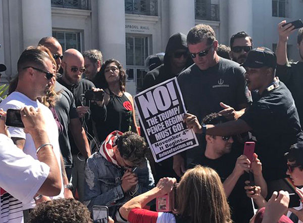 But in many ways Milo’s departure was just the beginning. For the next two plus hours there were tense standoffs and exchanges between roughly 100 to 125 people protesting fascism and Milo, and a roughly equal number of organized fascist thugs—from all across California—and their supporters and hangers on. Those who came out and stood up—and there should have been many more—courageously and heroically stood their ground in the face of fascist harassment, threats, videotaping, and attempts at intimidation.