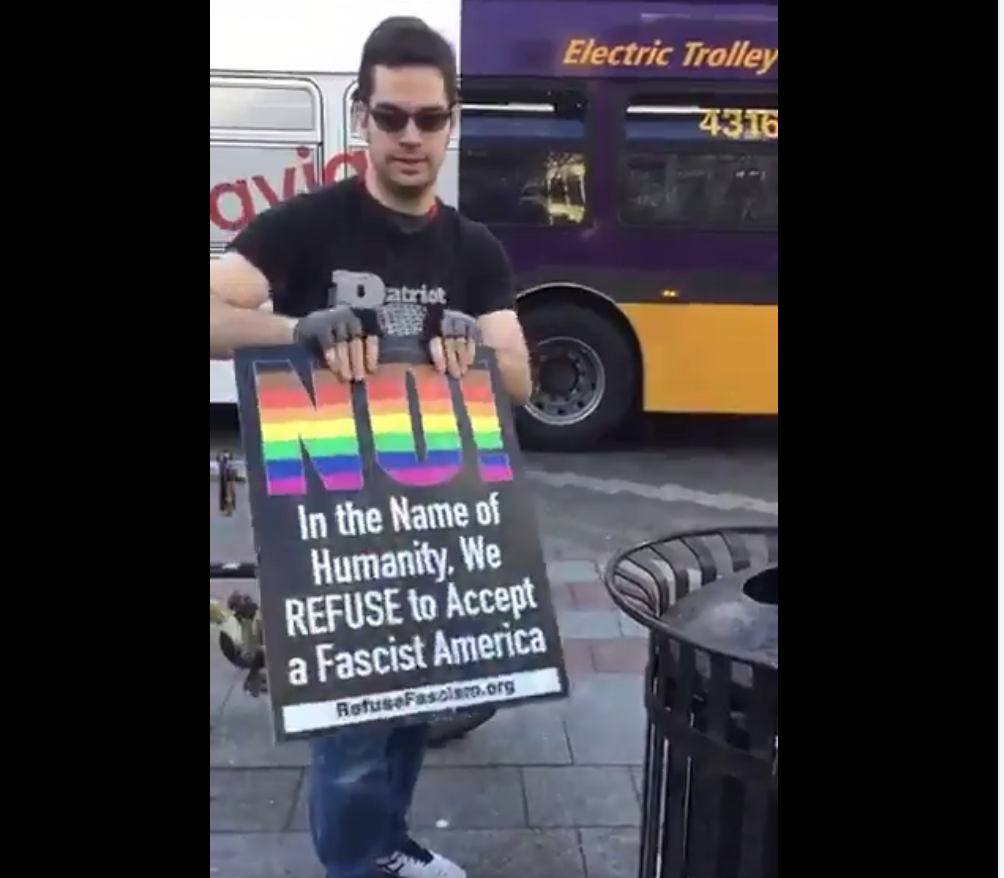 Funny, but also deadly serious,” says RefuseFascism.org spokesperson Sunsara Taylor After a video went viral of a man picking a fight with – and losing spectacularly – RefuseFascism.org poster on May 1, RefuseFascism.org has offered to send one of their indestructible signs to anyone anywhere in the country who makes a donation to their movement. “Obviously, it is hysterical to watch this pro-fascist fool get defeated by our sign,” said RefuseFascism.org spokesperson Sunsara Taylor, “But really, it is no laughing matter. The Trump/Pence Regime has incited and unleashed fascists and white supremacists everywhere and pushing hard to consolidate fascism in this country. This whole regime must go – that’s why people need to get their own signs.” The indestructible RefuseFascism signs are now available on the NO! shop.The sign that so frustrated the pro-fascist vandal read, “No! In the Name of Humanity, We REFUSE to Accept a Fascist America. RefuseFascism.org.” The video has been watched over 800,000 times to the delight of a great many and has been written about at Newsweek,DailyKos, Spin, TeenVogue. Through all his failed attempts to rip up the sign, a woman’s voice can be heard on the video mockingly egging him on. RefuseFascism.org, while very proud of its sign and happy for the viral coverage, is critical of the media thus far for not crediting its organization for having created and spread the sign. RefuseFascism.org is a movement of people coming from diverse perspectives, united in the recognition that the Trump/Pence Regime poses a catastrophic danger to humanity and the planet, and that the people must drive them from power through nonviolent protests that grow every day until our demand is met. The movement is currently working and organizing across the country to get in position to launch a new kind of protest: mass sustained nonviolent outpourings that begin with many thousands in several cities and grow day after day to include millions and do not stop until this demand is met: This Nightmare Must End: The Trump/Pence Regime Must Go!