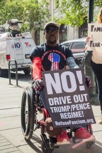 All the while we were leading chants, opening up the amplifier system for speak outs, flyering to everyone, doing interviews with press, collecting donations, getting people involved right off the street and right away, interviewing people who had come on their motivations and various outlooks, and bringing in anyone from anywhere by corresponding with them and answering their comments directly on the livestream. We were joined by members of ADAPT Philly, the Hebrew Immigrant Aid Society (HIAS) who aid refugees from all faiths or none from all over the world, Pennsylvania Immigration and Citizenship Coalition (PPIC), a couple of immigration lawyers whose firm told them to come out, people who had worked on Bernie Sanders campaign, Revolutionary communists, high school students, and the owner of a local bike store who brought a sound system to raise the volume of our measly megaphones. But this is not because we are some cool group of slick activists that fell from the sky. Once again, our choices and expression were based on understanding that this regime has got to go. That is what we have been and are being forged in. Here is where we see profound ingenuity and creativity that is expressed by people even as they are in the midst of a deadly situation, once they really grasp what’s going on here.