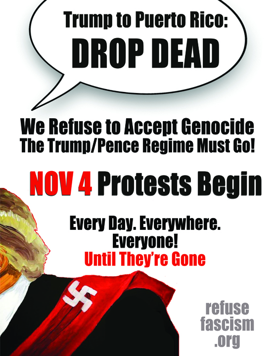 We will gather in the streets and public squares of cities and towns across this country, at first many thousands declaring that this whole regime is illegitimate and that we will not stop until our single demand is met: This Nightmare Must End: the Trump/Pence Regime Must Go!