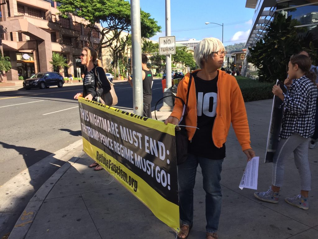 On Black Friday a Refuse Fascism team of 8 went an intersection near the entrance to Hawai`i’s largest shopping center to leaflet and hold signs. We got out hundreds of leaflets (Click here for printable flyers (PDF of the Refuse Fascism leaflet we were passing out!). Many people stopped right there to read and respond.  Several groups of teens greeted us with “Fuck Donald Trump”; many people agonized about the need for people to “wake up and act”  and were challenged to check out the website and join the movement.  There were a lot of tourists from Australia and Canada who talked about how Trump’s policies are effecting the world (especially pointing to Trump’s attacks on the environment).