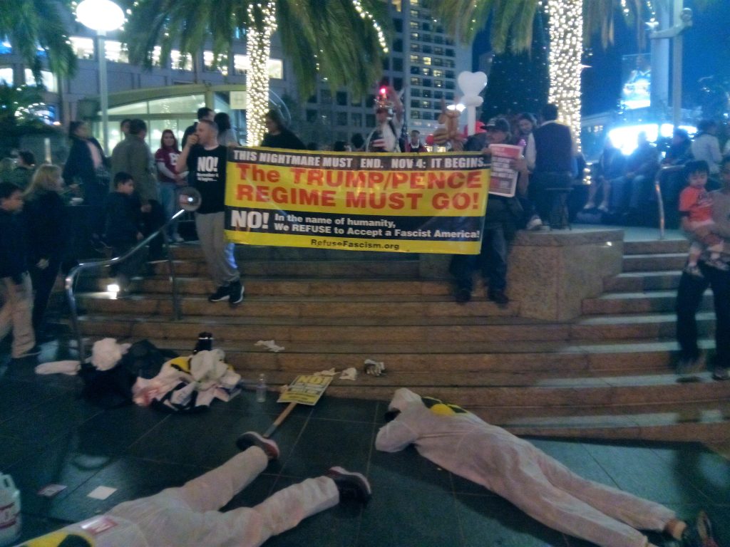 Black Friday, a Refuse Fascism crew with a bullhorn, a banner, three people wearing hazmat suits, and a small group flyering, collecting funds and names, took over a busy corner of Union Square in San Francisco – the heart of the city’s upscale shopping and hotel district, and staged a die-in.