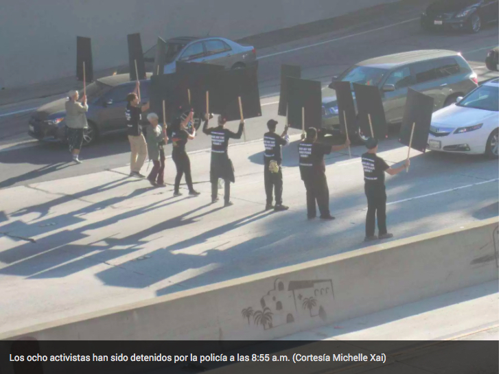 Un grupo de ocho manifestantes, cada uno con pancartas negras en la que podía leerse: “el 4 de noviembre comienza”, han cortado el tráfico de coches este martes en la autopista 101 a su paso por el centro de Los Ángeles; suceso que ha durado hasta aproximadamente las 8:55 a.m. momento en el que han sido cacheados y detenidos por la policía, según ha podido presenciar La Opinión.